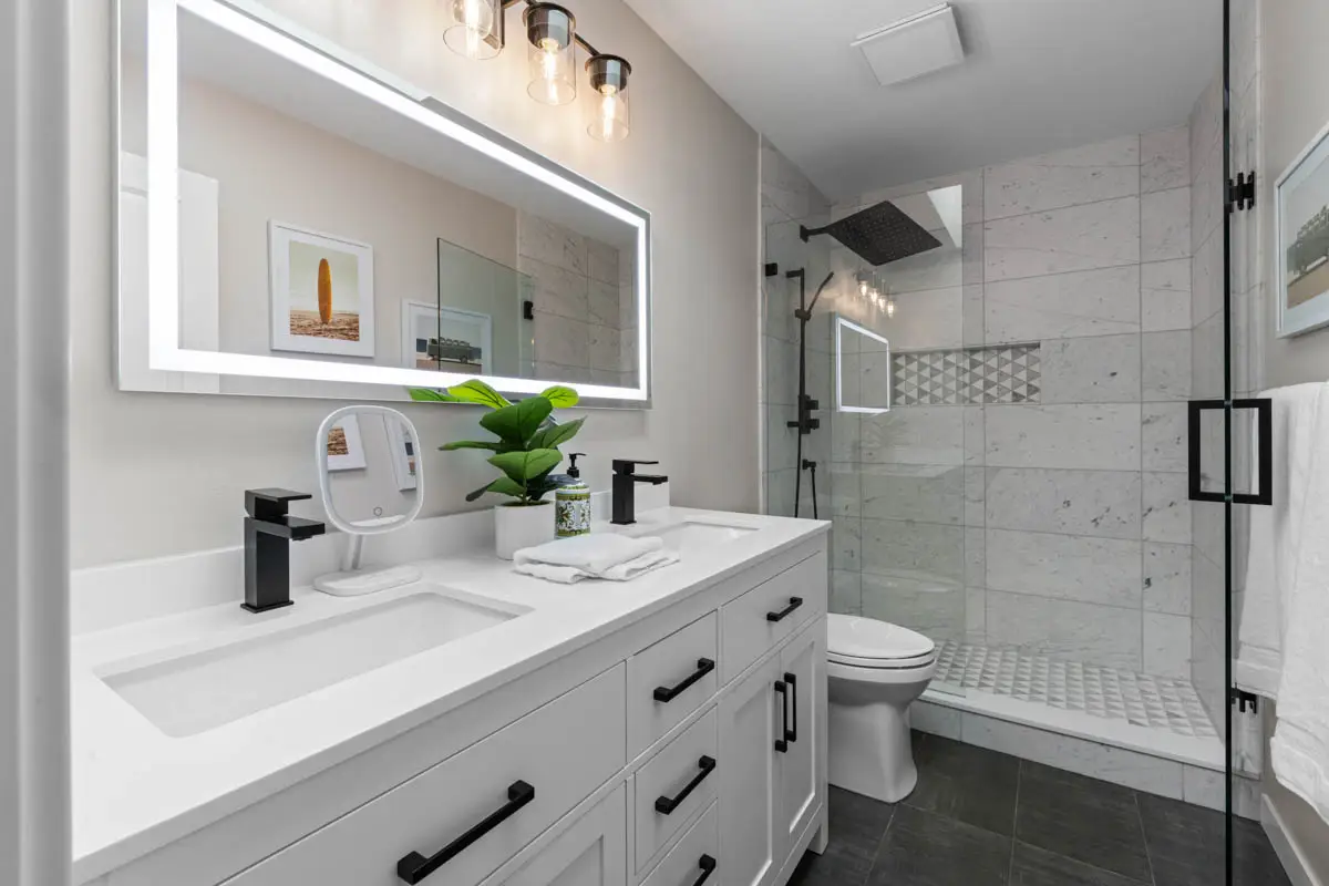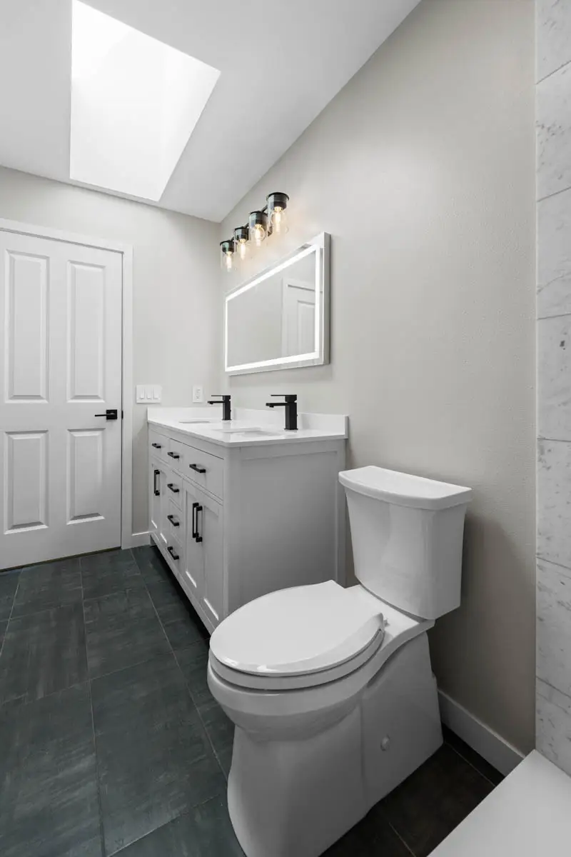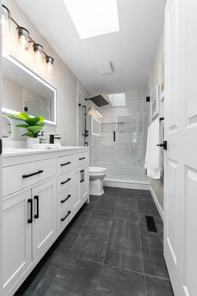 The completed renovation provides a balanced, modern aesthetic while maintaining the durability expected from a full bathroom remodel.