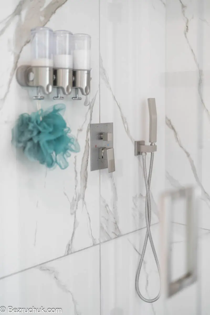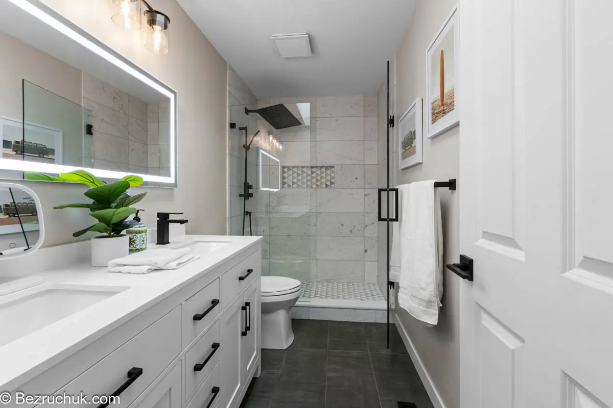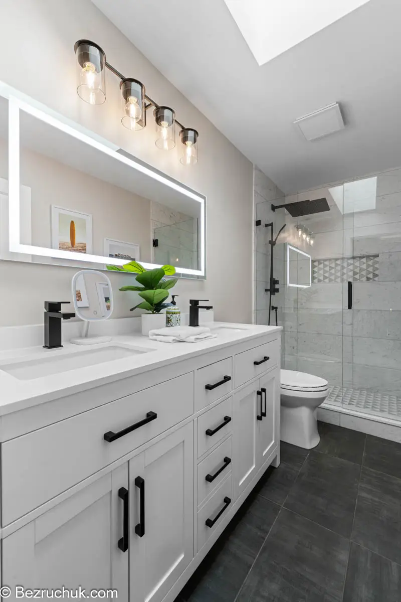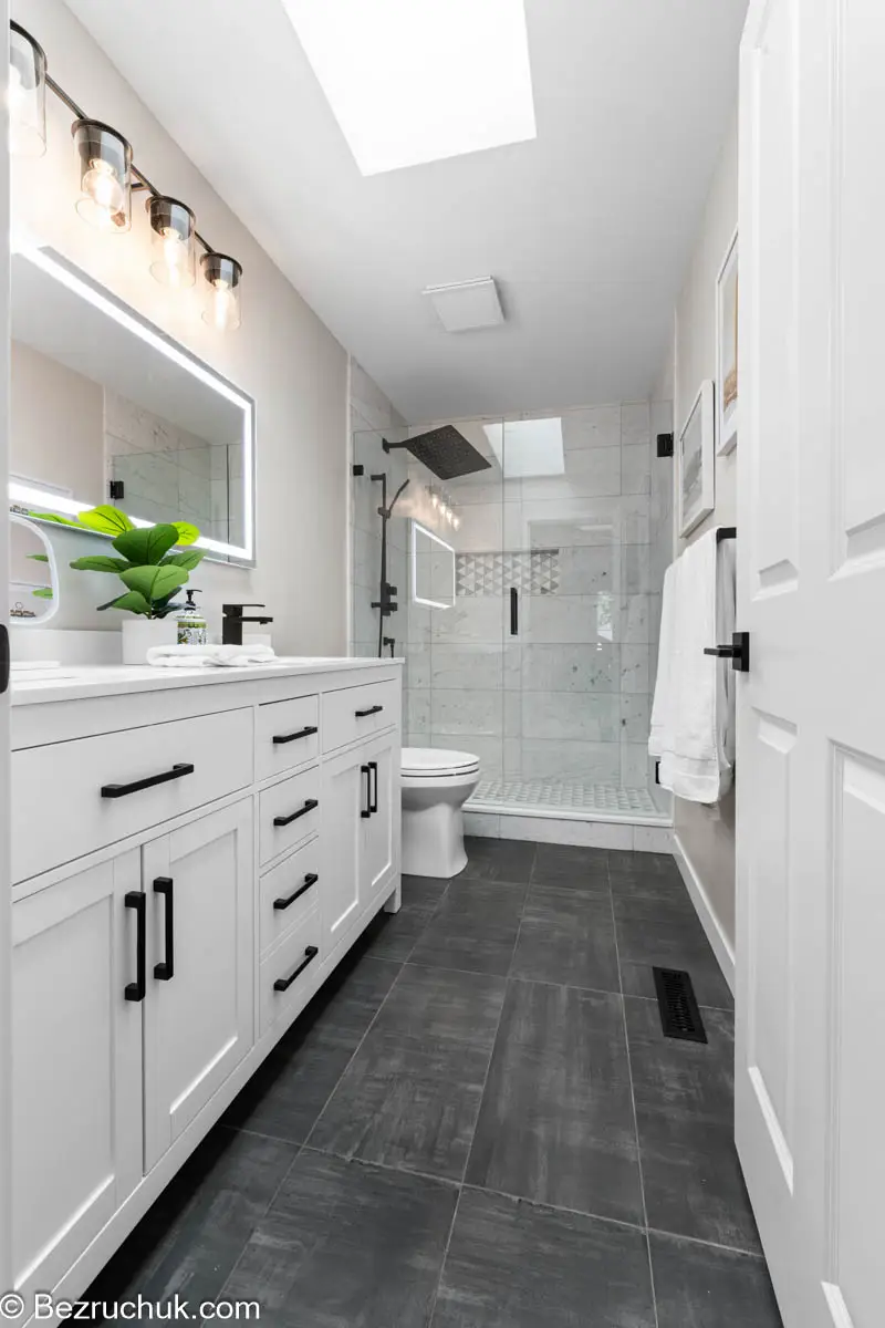 The completed renovation provides a balanced, modern aesthetic while maintaining the durability expected from a full bathroom remodel.