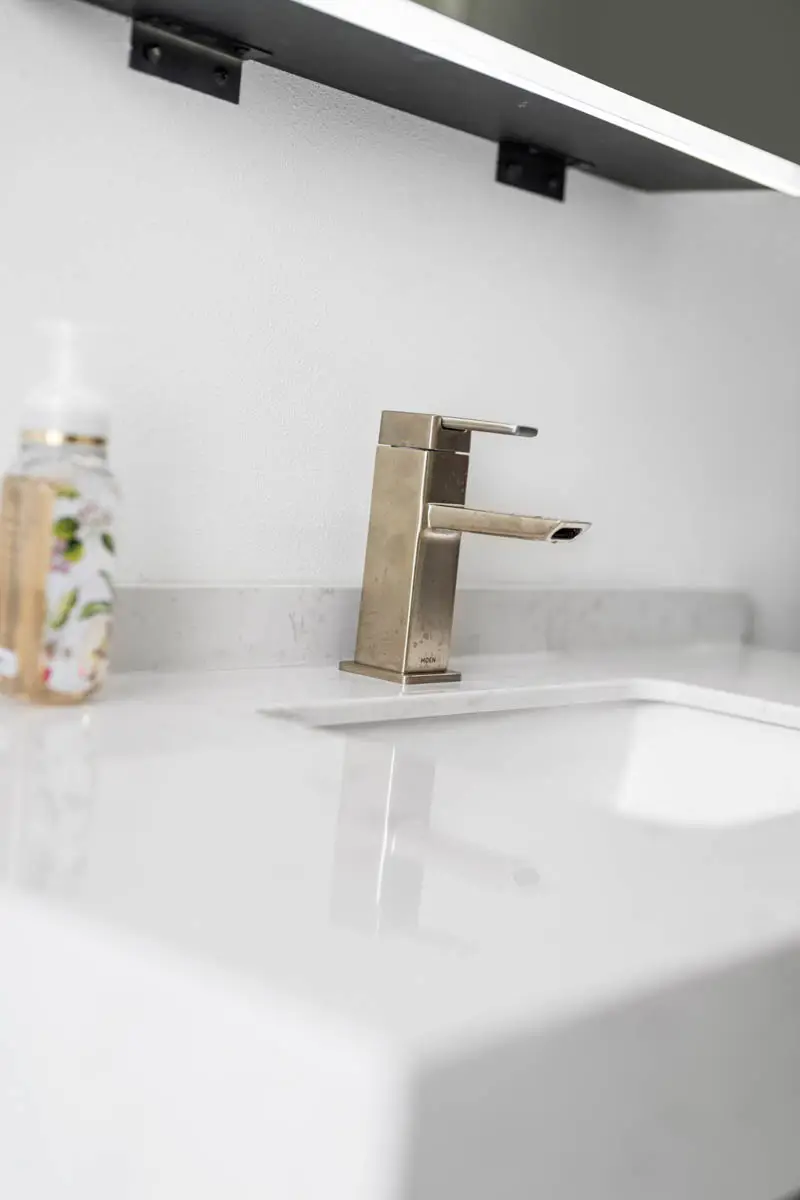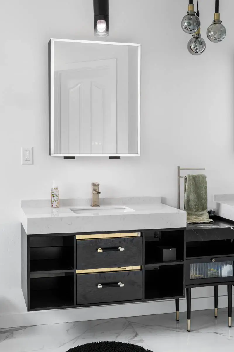 The vanity was selected to provide adequate storage without overwhelming the space. Hardware and fixtures were chosen for reliability and ease of maintenance.