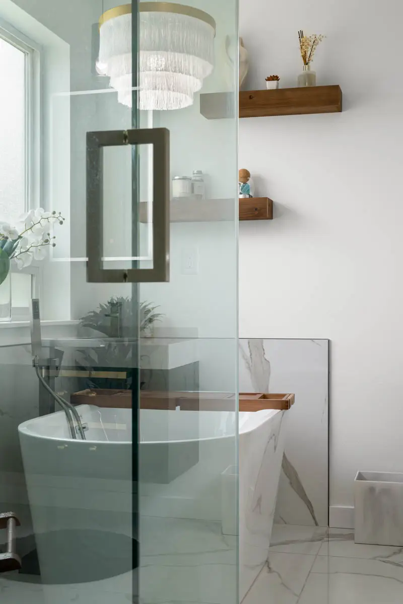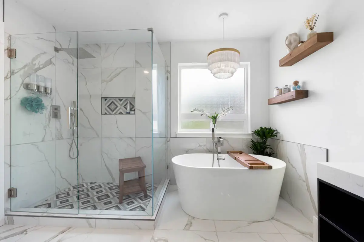 Installing a freestanding tub during a bathroom remodel requires precise planning, especially when paired with a nearby shower. Proper clearances and floor support were considered during installation.