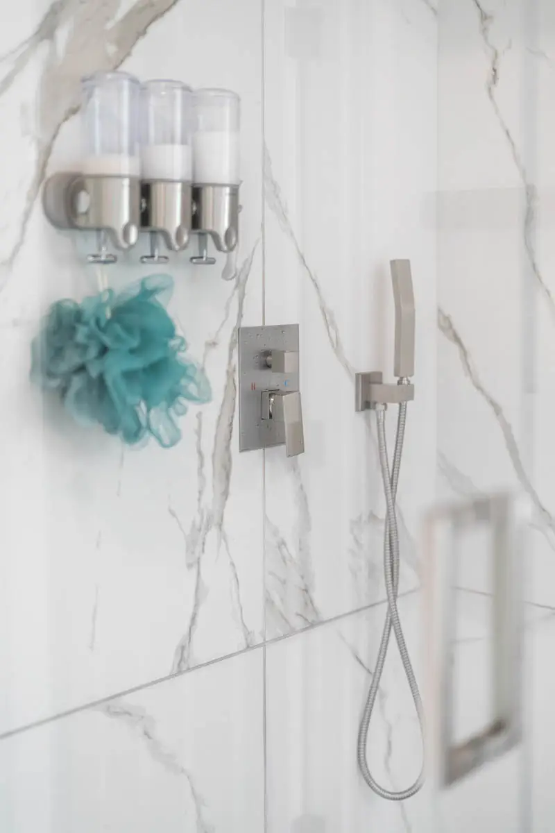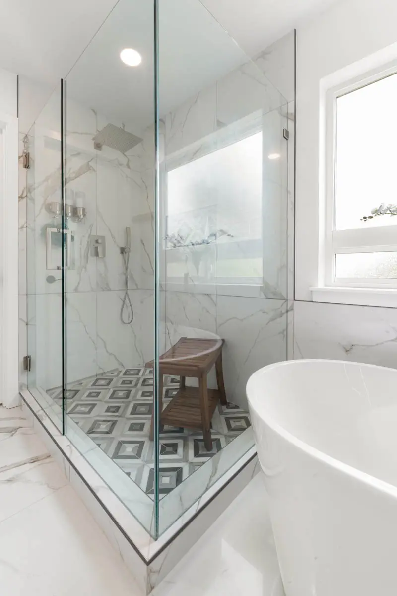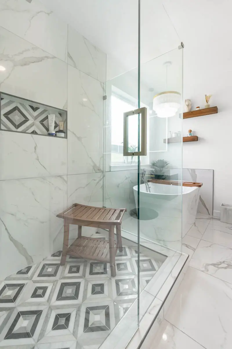 The new shower was designed with both durability and comfort in mind. Large-format wall tile was selected to reduce grout lines and create a clean, modern appearance. A patterned tile floor added visual interest while maintaining proper drainage.